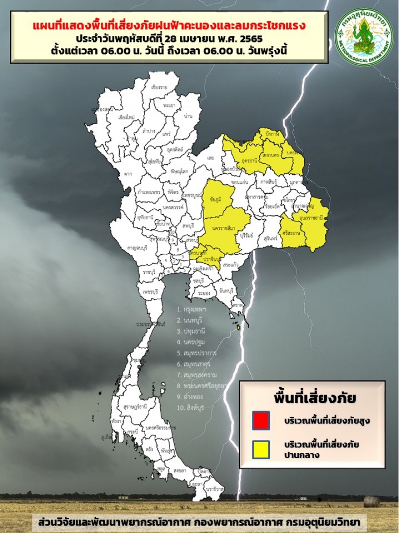 กรมอุตุฯ รายงานแผนที่แสดงพื้นที่เสี่ยงภัยฝนตกหนักถึงหนักมาก ประจำวันที่ 28 เมษายน 2565 ตั้งแต่เวลา 06.00 น. ถึงเวลา 06.00 น. วันที่ 29 เมษายน 2565 โดยจังหวัดที่เป็นพื้นที่เสี่ยงภัยสีเหลืองดังนี้