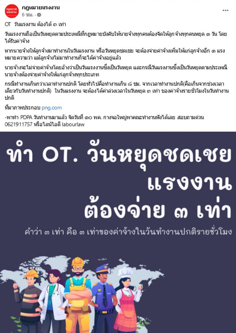 วันที่ 1 พ.ค.65 มีรายงานว่า ในเฟซบุ๊กเพจ กฎหมายแรงงาน โพสต์ข้อความระบุว่า วันแรงงานถือเป็นวันหยุดตามประเพณีที่กฎหมายบังคับให้นายจ้างทุกคนต้องจัดให้ลูกจ้างทุกคนหยุด ๑ วัน โดยได้รับค่าจ้าง
