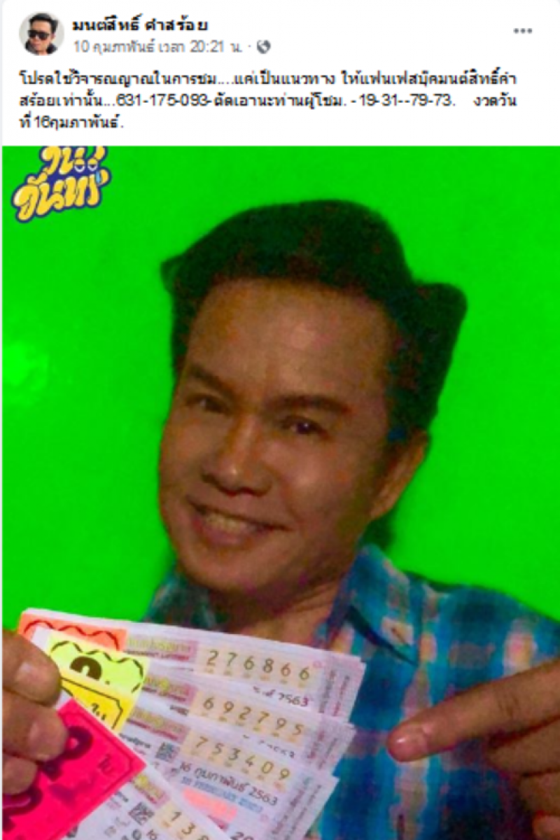 ใกล้เข้ามาแล้วสำหรับการประกาศรางวัลประจำวันที่ 16 กุมภาพันธ์ 2563 สำหรับใครที่ยังไม่มีเลขวันนี้ทีมงานของเราก็มีเลขมาฝากกันอีกเช่นเคย สำหรับเลขของมนต์สิทธิ์ที่เคยให้ถูกมาหลายครั้งแล้ว โดยในวันที่ 10 กุมภาพันธ์ ที่ผ่านมา ก็ได้ออกมาโพสต์ภาพลอตเตอรี่ โดยได้ระบุข้อความว่า