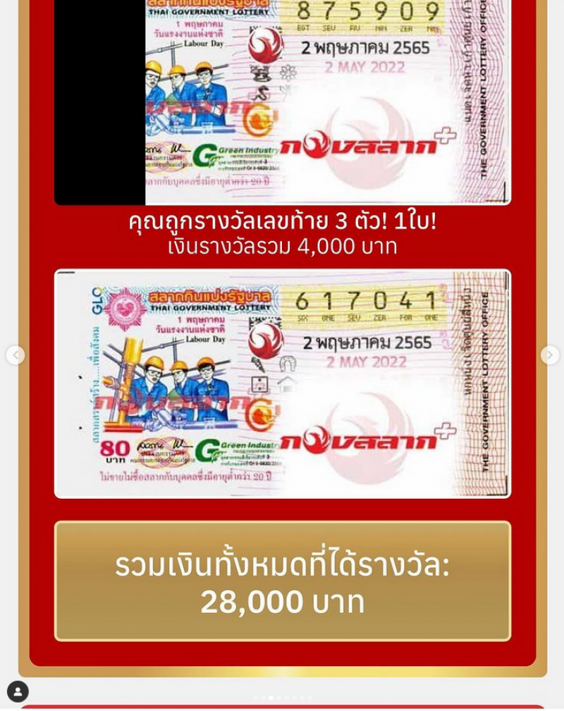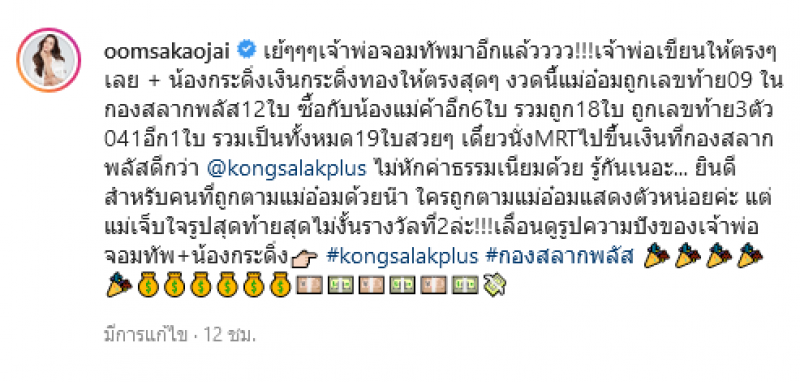 เรียกได้ว่าเป็นอีกหนึ่งดาราที่ถูกรางวัลบ่อยมากสำหรับ อ๋อม สกาวใจ ที่ล่าสุดได้เฮลั่นอีกแล้ว กับผลสลากกินแบ่งรัฐบาล ประจำวันที่ 2 พฤษภาคม 2565 โดย แม่อ๋อม โพสต์ภาพถูกรางวัลคู่กับลูกชาย ระบุว่า เย้ๆๆๆเจ้าพ่อจอมทัพมาอีกแล้วววว!!!เจ้าพ่อเขียนให้ตรงๆเลย + น้องกระดิ่งเงินกระดิ่งทองให้ตรงสุดๆ งวดนี้แม่อ๋อมถูกเลขท้าย09 ในกองสลากพลัส12ใบ ซื้อกับน้องแม่ค้าอีก6ใบ รวมถูก18ใบ ถูกเลขท้าย3ตัว 041อีก1ใบ รวมเป็นทั้งหมด19ใบสวยๆ เดี๋ยวนั่งMRTไปขึ้นเงินที่กองสลากพลัสดีกว่า @kongsalakplus ไม่หักค่าธรรมเนียมด้วย รู้กันเนอะ... ยินดีสำหรับคนที่ถูกตามแม่อ๋อมด้วยน๊า ใครถูกตามแม่อ๋อมแสดงตัวหน่อยค่ะ แต่แม่เจ็บใจรูปสุดท้ายสุดไม่งั้นรางวัลที่2ล่ะ!!!เลื่อนดูรูปความปังของเจ้าพ่อจอมทัพ+น้องกระดิ่ง