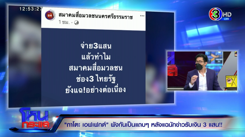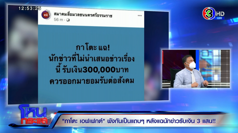 วันที่ 3 พ.ค.65 ในรายการโหนกระแส ดำเนินรายการโดยพิธีกรดัง หนุ่ม กรรชัย ได้เปิดใจนายไพฑูรย์ อินทศิลา ผู้สื่อข่าวท้องถิ่นใน จ.นครศรีธรรมราช ถึงกรณีอดีตพระกาโตะถึงปมเงิน 3 แสนบาทที่อ้างจ่ายให้คนกลางไปเคลียร์ให้สื่อท้องถิ่นปิดข่าว