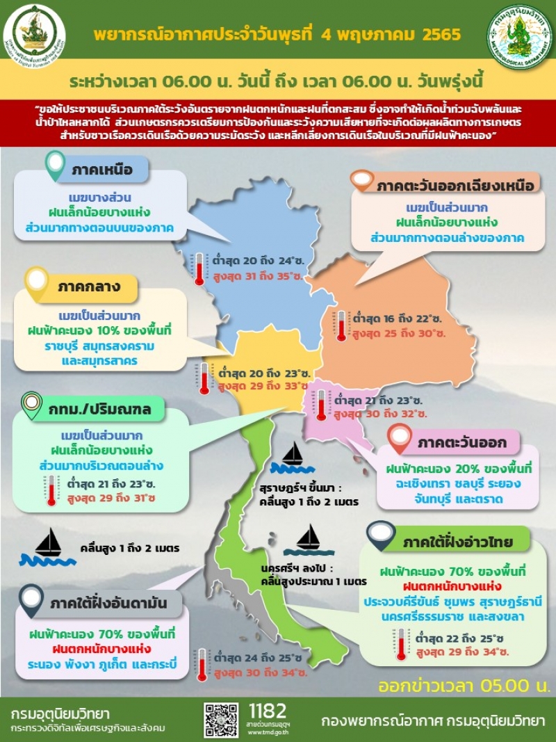 นางสาวชมภารี ชมภูรัตน์ อธิบดีกรมอุตุนิยมวิทยา เปิดเผยถึงคาดการณ์สภาพอากาศ 3-7 วันข้างหน้า ว่า ช่วงต้นเดือนพฤษภาคมนี้จะมีฝนตกต่อเนื่องจนถึงกลางเดือน เป็นช่วงผลัดเปลี่ยนฤดู โดยกรมอุตุฯจะมีการประเมินการเข้าสู่ช่วงฤดูฝนอย่างเป็นทางการในปลายเดือนพฤษภาคมนี้ ซึ่งในระยะเวลานี้จะรวบรวมข้อมูลและพิจารณาจากหลักเกณฑ์ 3 ประการ คือ อากาศ ปริมาณน้ำฝนที่ตกต่อเนื่อง และทิศทางลมที่พัดในระดับบนและผิวพื้น นำมาประกอบการพิจารณาและจะประกาศให้ประชาชนทราบต่อไป