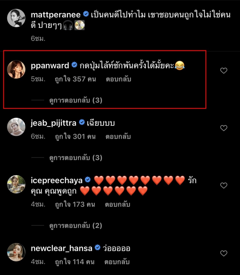 อีกทั้งงานนี้หลัง สาวแมท ได้โพสต์แคปชั่นสุดเจ็บจี๊ด ทางด้าน สาวเป้ย ปานวาด ก็ได้เเสดงความคิดเห็นว่า กดปุ่มไลค์ซักพันครั้งได้มั้ยคะ บอกเลยงานนี้ไม่ต้องบอกก้รู้ว่าทีมใครนะจ๊ะ