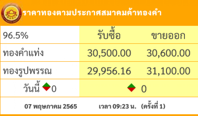 วันที่ 7 พฤษภาคม 2565 สมาคมค้าทองคำรายงาน ราคาทองไทย ครั้งที่ 1 เมื่อเวลา 09:23 น. โดยราคาทองล่าสุดราคานั้น ทองคำ แท่ง รับซื้อบาทละ 30,500 ขายออกบาทละ 30,600 บาท ส่วนทองรูปพรรณ รับซื้อบาทละ 29,956.16 ขายออกบาทละ 31,100 บาท