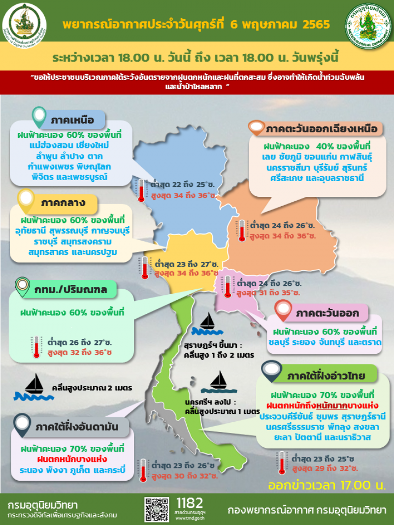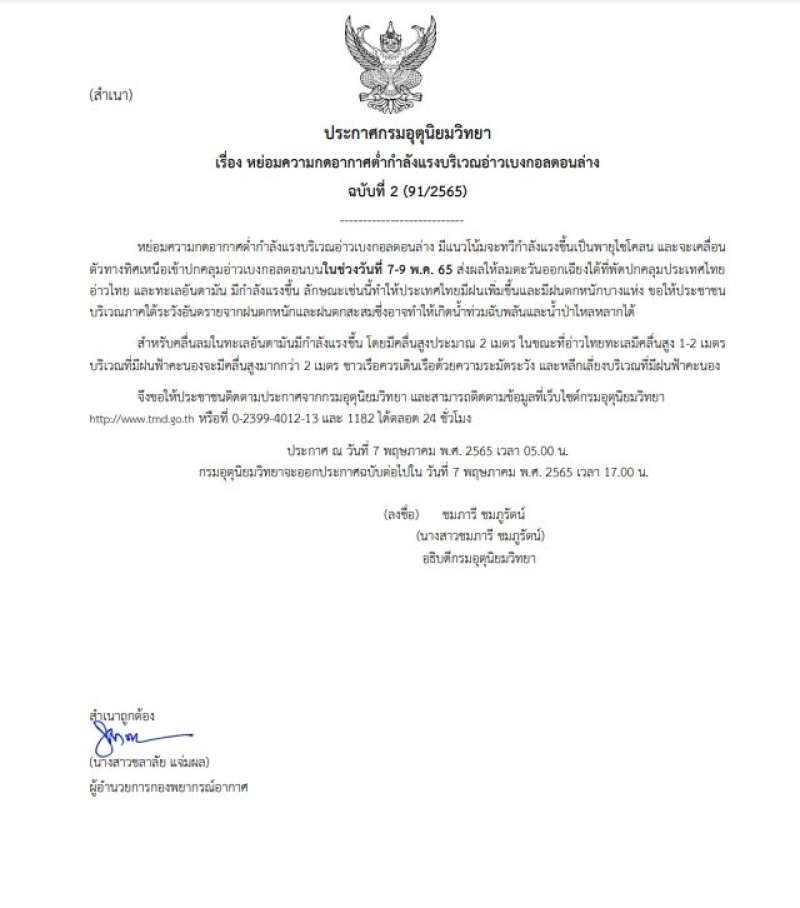 วันที่ 7 พ.ค.65 กรมอุตุนิยมวิทยา ออกประกาศกรมอุตุฯ หย่อมความกดอากาศต่ำกำลังแรงบริเวณอ่าวเบงกอลตอนล่าง ฉบับที่ 2 ลงวันที่ 07 พฤษภาคม 2565 ความว่า หย่อมความกดอากาศต่ำกำลังแรงบริเวณอ่าวเบงกอลตอนล่าง มีแนวโน้มจะทวีกำลังแรงขึ้นเป็นพายุไซโคลน และจะเคลื่อนตัวทางทิศเหนือเข้าปกคลุมอ่าวเบงกอลตอนบนในช่วงวันที่ 7-9 พ.ค. 65 ส่งผลให้ลมตะวันออกเฉียงใต้ที่พัดปกคลุมประเทศไทย อ่าวไทย และทะเลอันดามัน มีกำลังแรงขึ้น