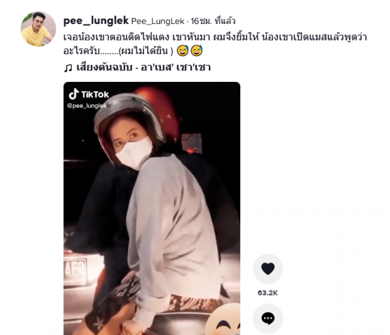 เรียกได้ว่าเป็นอีกหนึ่งเรื่องราวที่ชาวโซเชียลต่างเข้ามาแสดงความคิดเห็นกันเป็นจำนวนมาก หลังได้มีชาวโซเชียลรายหนึ่งได้โพสต์คลิปลงติ๊กต๊อก ซึ่งเป็นคลิปที่ถ่ายไว้ขณะติดไฟแดง ซึ่งหนุ่มรายนี้ได้เจอผู้หญิงคนนึง นั่งซ้อนมอไซต์มากับแฟน ซึ่งตอนนั้นเองเธอก็ได้หันมามอง ทางเจ้าของโพสต์ก็ได้ยิ้มให้ ซึ่งฝ่ายหญิงก็ได้เปิดแมส และพูดด้วยเสียงกระซิบ ซึ่งชายคนดังกล่าวก็ได้โพสต์คลิปลงโซเชียล ว่าประโยคที่ที่ผู้หญิงคนนั้นพูดคือว่าคำว่าอะไร โดยได้โพสต์ระบุข้อความว่า เจอน้องเขาตอนติดไฟแดง เขาหันมา ผมจึงยิ้มให้ น้องเขาเปิดแมสแล้วพูดว่าอะไรครับ........(ผมไม่ได้ยิน )