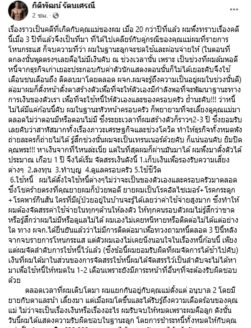 ตลอดเวลาที่ผมเติบโตมา ผมแยกกันอยู่กับคุณแม่ตั้งแต่ อนุบาล 2 โดยมียายกับตาและน้า เลี้ยงมา แต่เมื่อผมโตขึ้นและได้รับรู้ถึงความเดือดร้อนของคุณแม่ ไม่ว่าจะเป็นเรื่องเงินหรือเรื่องอะไร ผมรับจบให้หมดเพราะผมคือลูก ดังนั้นวันนี้ผมได้แสดงความรับผิดชอบในฐานะลูก โดยการชำระหนี้ทั้งหมดให้กับคุณแม่ เป็นจำนวนเงิน 600,000 บาท และได้แนบหลักฐานไว้แล้วคับ