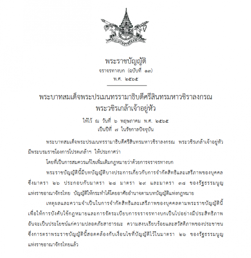วันที่ 10 พ.ค.2565 ผู้สื่อข่าวรายงานว่า เว็บไซต์ราชกิจจานุเบกษา เผยแพร่ พ.ร.บ.จราจรทางบก (ฉบับที่ 13) พ.ศ.2565 เมื่อวันที่ 7 พ.ค.2565 จำนวน 18 หน้า โดยพระราชบัญญัตินี้ให้ใช้บังคับเมื่อพ้นกำหนด 120 วัน นับแต่วันประกาศในราชกิจจานุเบกษาเป็นต้นไป หรือมีผลบังคับใช้ในอีก 4 เดือนข้างหน้า หรือประมาณวันที่ 5 ก.ย.2565