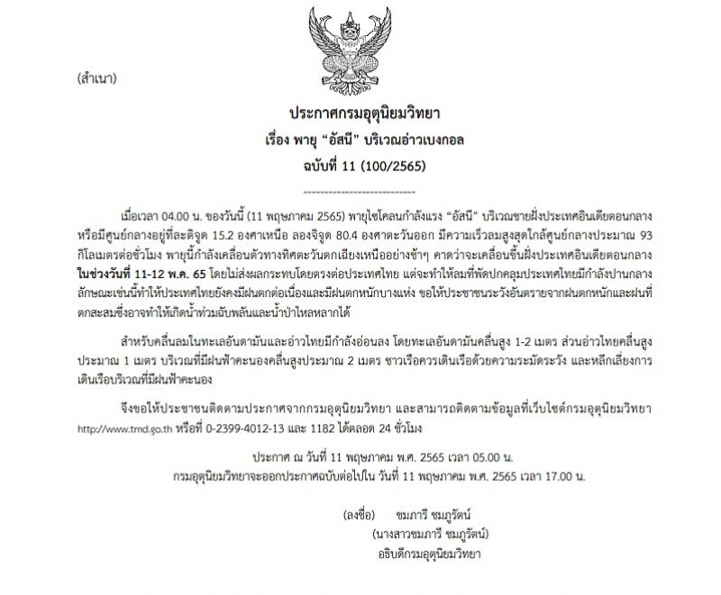 วันที่ 11 พ.ค.2565 กรมอุตุนิยมวิทยา ประกาศ พายุ อัสนี บริเวณอ่าวเบงกอล ฉบับที่ 11 ระบุว่า เมื่อเวลา 04.00 น.ของวันนี้ (11 พฤษภาคม 2565) พายุไซโคลนกำลังแรง อัสนี บริเวณชายฝั่งประเทศอินเดียตอนกลาง หรือมีศูนย์กลางอยู่ที่ละติจูด 15.2 องศาเหนือ ลองจิจูด 80.4 องศาตะวันออก มีความเร็วลมสูงสุดใกล้ศูนย์กลางประมาณ 93 กิโลเมตรต่อชั่วโมง