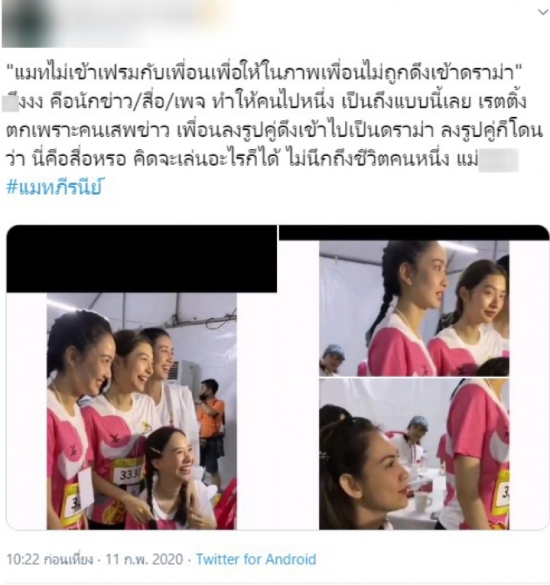 แมทไม่เข้าเฟรมกับเพื่อนเพื่อให้ในภาพเพื่อนไม่ถูกดึงเข้าดราม่า คือนักข่าว สื่อ เพจ ทำให้คนไปหนึ่ง เป็นถึงแบบนี้เลย เรตติ้งตกเพราะคนเสพข่าว เพื่อนลงรูปคู่ดึงเข้าไปเป็นดราม่า ลงรูปคู่ก็โดนว่า นี่คือสื่อหรอ คิดจะเล่นอะไรก็ได้ ไม่นึกถึงชีวิตคนหนึ่ง แมทภีรนีย์