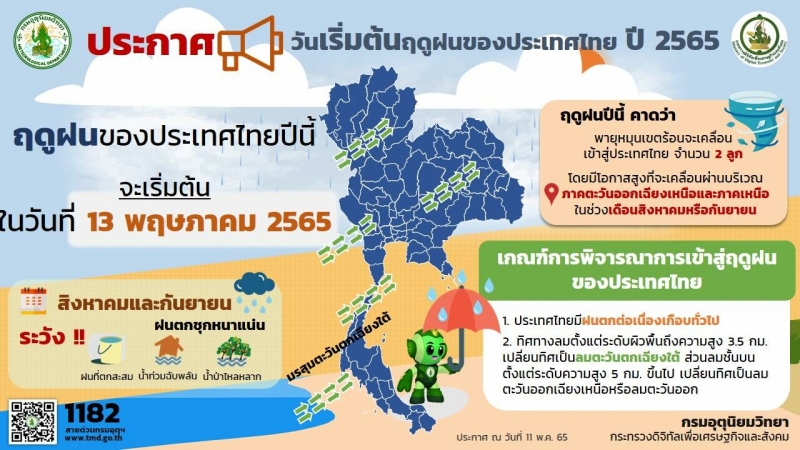 วันที่ 11 พ.ค.65 กรมอุตุฯ ประกาศคาดว่าจะสิ้นสุดฤดูร้อน และเริ่มต้นเข้าสู่ฤดูฝน ในวันที่ 13 พ.ค.65 เนื่องจากมีฝนตกชุกและต่อเนื่องครอบคลุมพื้นที่ส่วนใหญ่ของประเทศ ประกอบกับลมที่พัดปกคลุมประเทศไทยที่ระดับผิวพื้นถึงความสูงประมาณ 3.5 กิโลเมตร ได้เปลี่ยนทิศเป็นลมตะวันตกเฉียงใต้