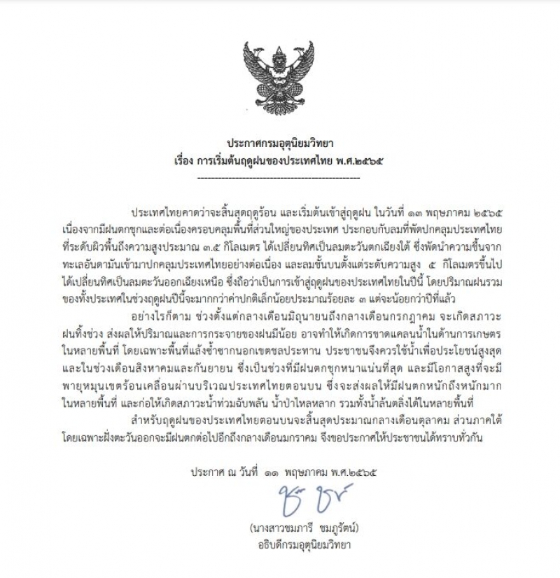 สำหรับฤดูฝนของประเทศไทยตอนบนจะสิ้นสุดประมาณกลางเดือนตุลาคม ส่วนภาคใต้โดยเฉพาะฝั่งตะวันออกจะมีผนตกต่อไปอีกถึงกลางเดือนมกราคม จึงขอประกาศให้ประชาชนได้ทราบทั่วกัน