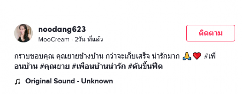 เรียกได้ว่ากลายเป็นอีกหนึ่งเรื่องราวดีๆ ที่น่าชื่นชมเป็นอย่างมาก หลังจากที่ผู้ใช้ tiktok ชื่อ noodang623 ได้เผยแพร่คลิปจากกล้องวงจรปิด ซึ่งเป็นสุดประทับใจ ที่คุณยายข้างบ้านได้มาช่วยเก็บผ้าที่ผู้โพสต์ตากไว้หน้าบ้านและได้เกิดฝนตกลงมาอย่างหนัก โดยในคลิปจะเห็นว่าคุณยายเก็บเข้าบ้านให้ด้วยความเรียบร้อย เป็นภาพที่ใครเห็นต่างก็ชื่นชมความมีน้ำใจของคุณยาย โดยผู้โพสต์ได้ระบุว่า...กราบขอบคุณ คุณยายข้างบ้าน กว่าจะเก็บเสร็จ น่ารักมาก