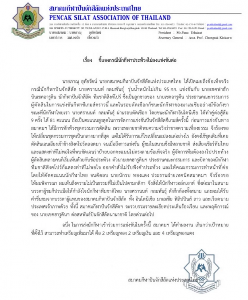 นายภาณุ อุทัยรัตน์ นายกสมาคมกีฬาปันจักสีลัตแห่งประเทศไทย ได้ส่งหนังสือชี้แจงประเด็นที่ให้นายศรานนท์ กลมพันธุ์ นักกีฬาทีมชาติไทย วอล์กเอาต์ออกจากการแข่งขันรอบชิงชนะเลิศ รุ่น 95 กิโลกรัม ที่พบกับเชคฟาฮัก บินเชคอารูดิน นักกีฬาทีมชาติสิงคโปร์ ซึ่งเป็นลูกชายของประธานกรรมการผู้ตัดสินในซีเกมส์ครั้งนี้
