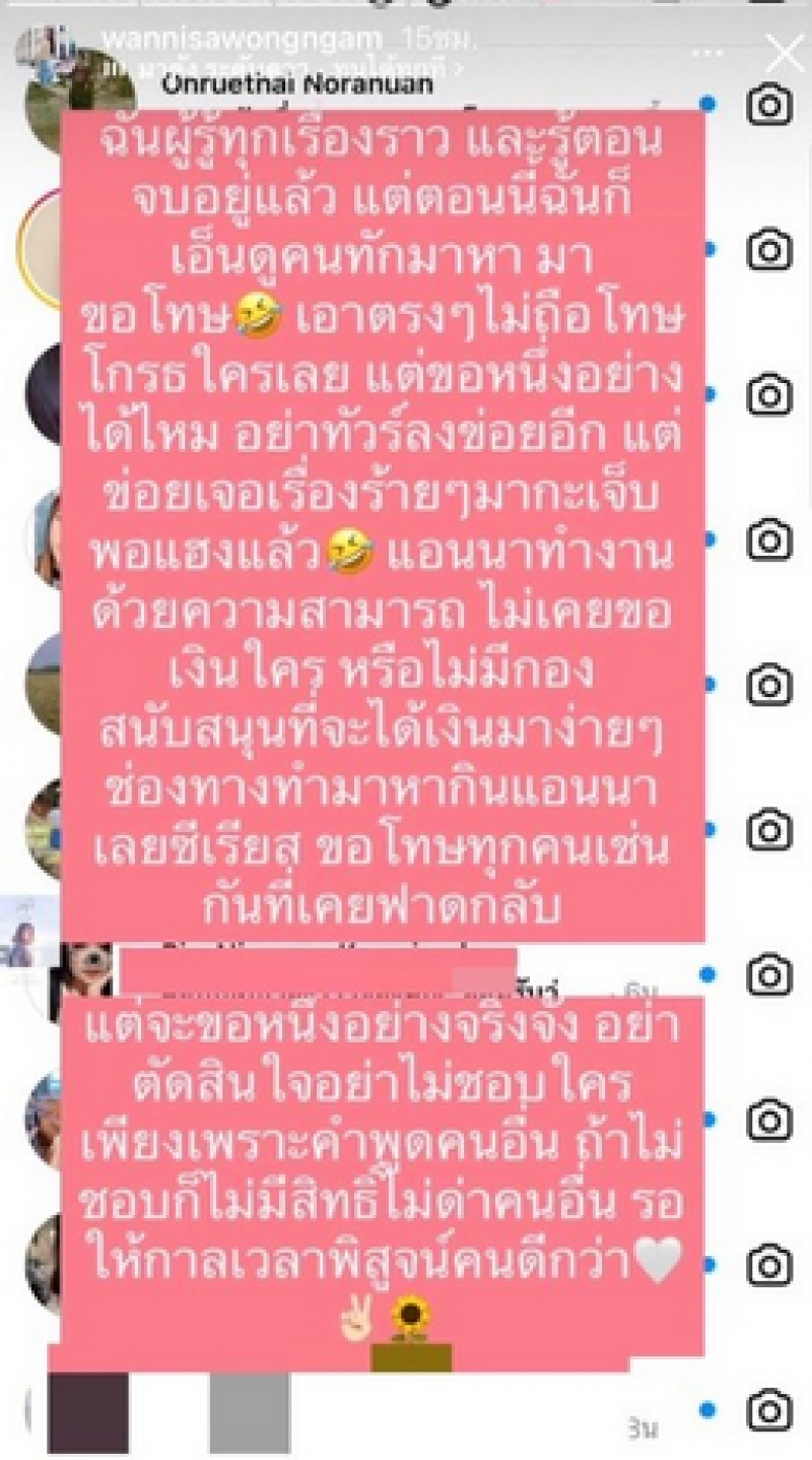 "ฉันผู้รู้ทุกเรื่องราว และรู้ตอนจบอยู่แล้ว แต่ตอนนี้ฉันก็เอ็นดูคนทักมาหา มาขอโทษเอาตรงๆไม่ถือโทษโกรธใครเลย แต่ขอหนึ่งอย่างได้ไหม อย่าทัวร์ลงข่อยอีก แต่ข่อยเจอเรื่องร้ายๆมากะเจ็บพอแฮงแล้ว แอนนาทำงานด้วยความสามารถ ไม่เคยขอเงินใคร หรือไม่มีกองสนับสนุนที่จะได้เงินมาง่ายๆช่องทางทำมาหากินแอนนาเลยซีเรียส ขอโทษทุกคนเช่นกันที่เคยฟาดกลับ