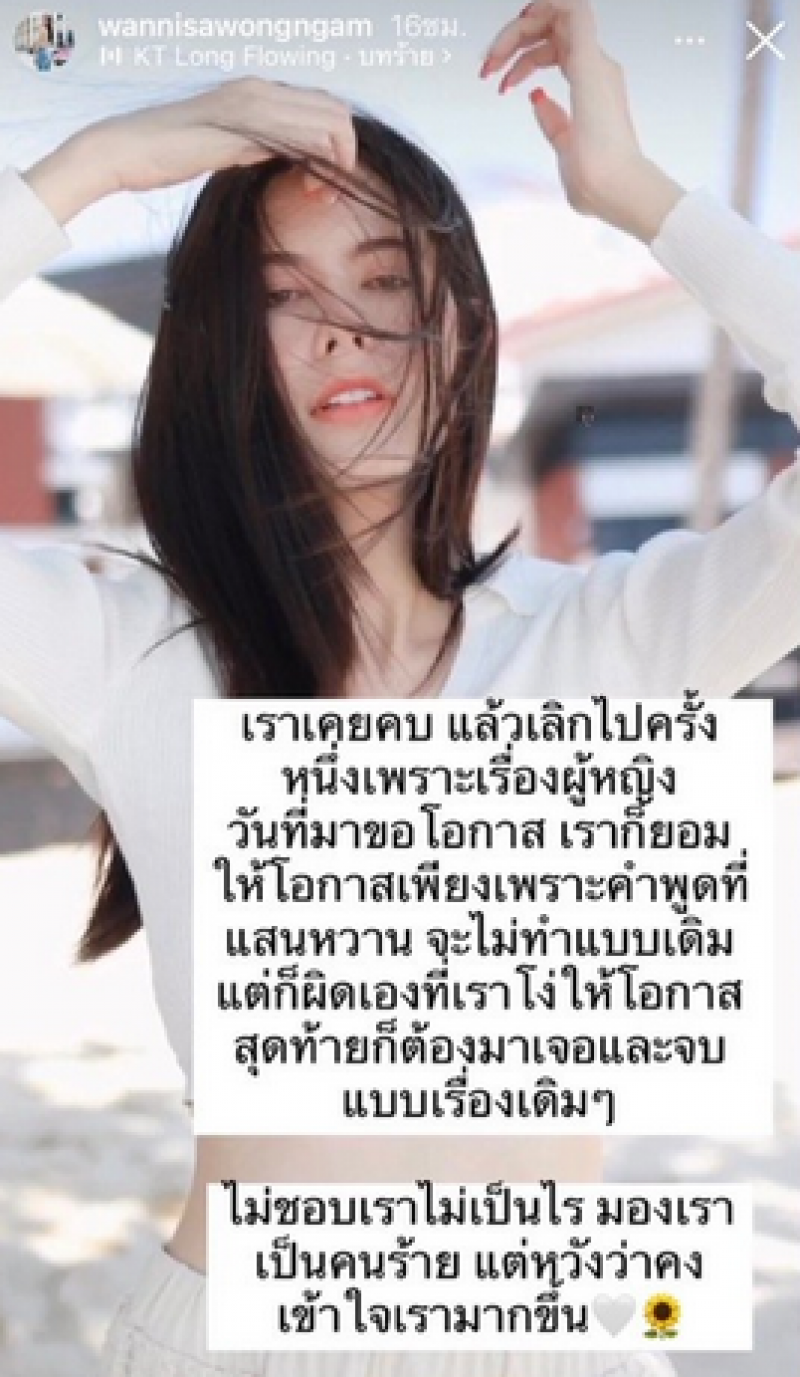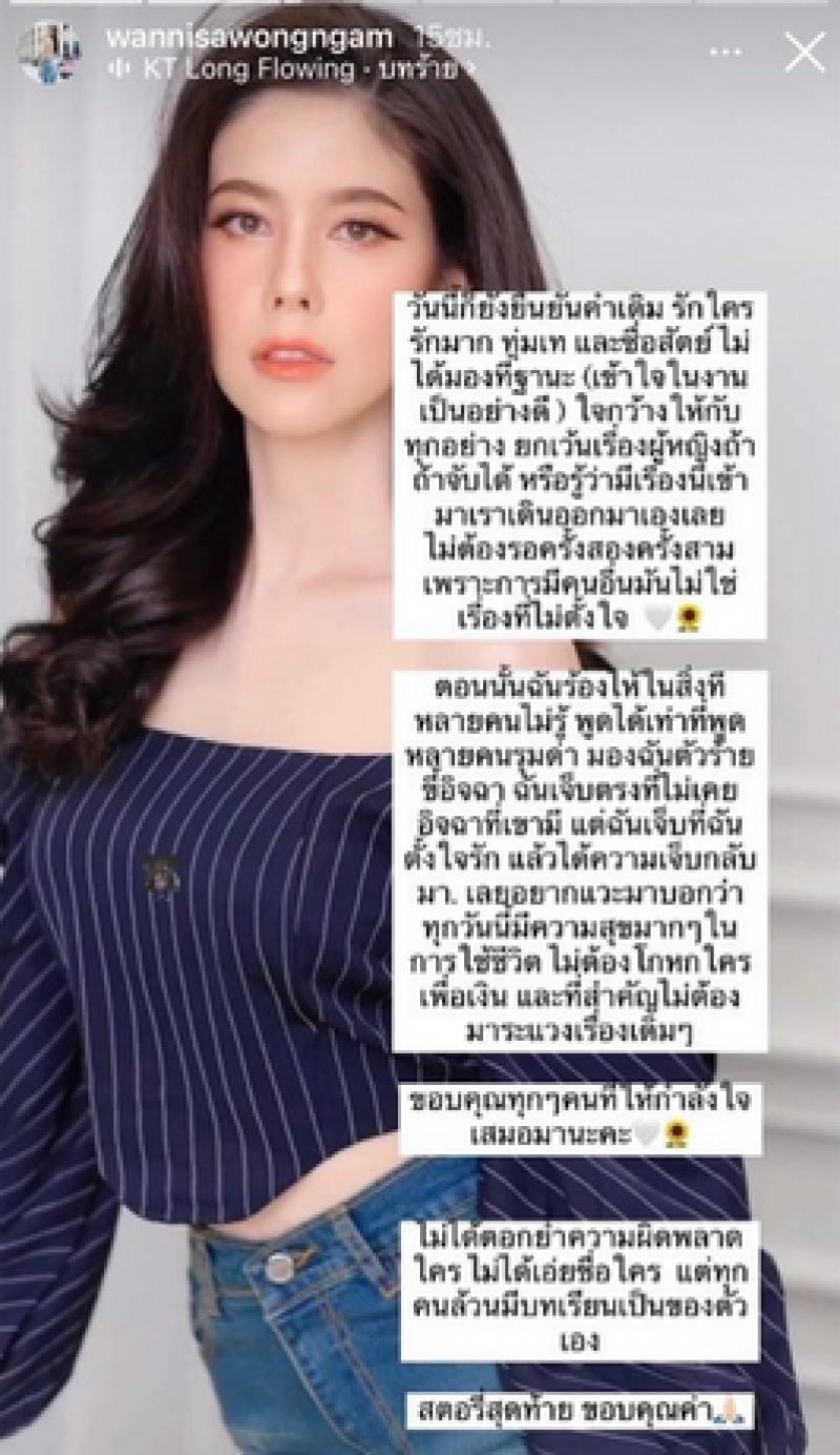 "วันนี้ก็ยังยืนยันคำเดิม รักใครรักมาก ทุ่มเท และซื่อสัตย์ ไม่ได้มองที่ฐานะ (เข้าใจในงานเป็นอย่างดี ) ใจกว้างให้กับทุกอย่าง ยกเว้นเรื่องผู้หญิงถ้าถ้าจับได้ หรือรู้ว่ามีเรื่องนี้เข้ามาเราเดินออกมาเองเลยไม่ต้องรอครั้งสองครั้งสามเพราะการมีคนอื่นมันไม่ใช่เรื่องที่ไม่ตั้งใจตอนนั้นฉันร้องไห้ในสิ่งทีหลายคนไม่รู้ พูดได้เท่าที่พูดหลายคนรุมด่ามองฉันตัวร้ายขี้อิจฉา ฉันเจ็บตรงที่ไม่เคยอิจฉาที่เขามี