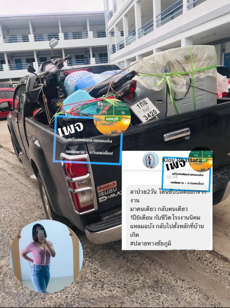 โดยทางเพจระบุว่าลาป่วย2วัน โดนซับปลดออกจากงาน มาคนเดียว กลับคนเดียว 1ปี6เดือน กับชีวิตโรงงานนิคมแหลมฉบัง กลับไปตั้งหลักที่บ้านเกิด #ปลายทางชัยภูมิ