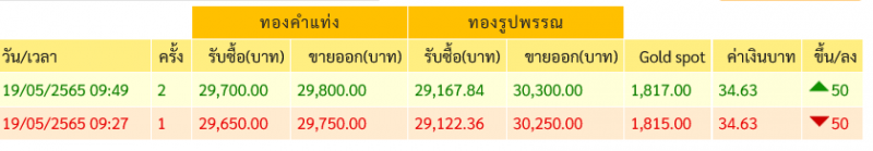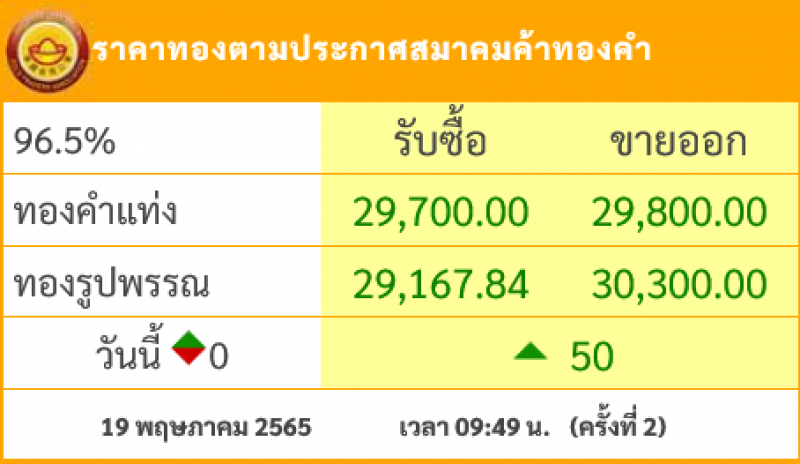 วันที่ 19 พฤษภาคม 2565 สมาคมค้าทองคำรายงาน ราคาทองไทย โดยราคาทองล่าสุดราคานั้น ราคาค่อนข้างผันผวน มีการปรับขึ้นลง ส่งผลให้ราคาทองวันนี้ ทองคำ แท่ง รับซื้อบาทละ 29,700 ขายออกบาทละ 29,800 บาท ส่วนทองรูปพรรณ รับซื้อบาทละ 29,167.84 ขายออกบาทละ 30,300 บาท