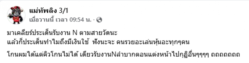 มีรายงานว่า ในเพจเฟซบุ๊ก แม่ทัพลิง 3/1 ได้มีการโพสต์คลิปพร้อมระบุข้อความอธิบายว่า มาเคลียร์ประเด็นรับงาน N ตามสายวัดนะ แล้วก็ประเด็นทำไมถึงมีเงินใช้ ฟังนะจะ คนรวยอะเล่นหุ้นอะทุกๆคน โกนผมได้แต่คิวโกนไม่ได้ เดียวรับงาน N ลำบากตอนแต่งหน้าไปกุฏิอื่น
