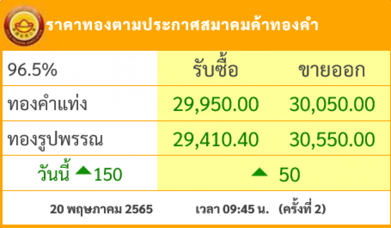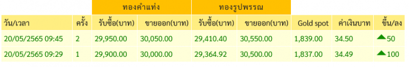 วันที่ 20 พฤษภาคม 2565 สมาคมค้าทองคำรายงาน ราคาทองไทย โดยราคาทองล่าสุดราคานั้น ได้มีการปรับขยับขึ้นมาในช่วงเช้า ส่งผลให้ราคาทองวันนี้ ทองคำ แท่ง รับซื้อบาทละ 29,950 ขายออกบาทละ 30,050 บาท ส่วนทองรูปพรรณ รับซื้อบาทละ 29,410.40 ขายออกบาทละ 30,550 บาท