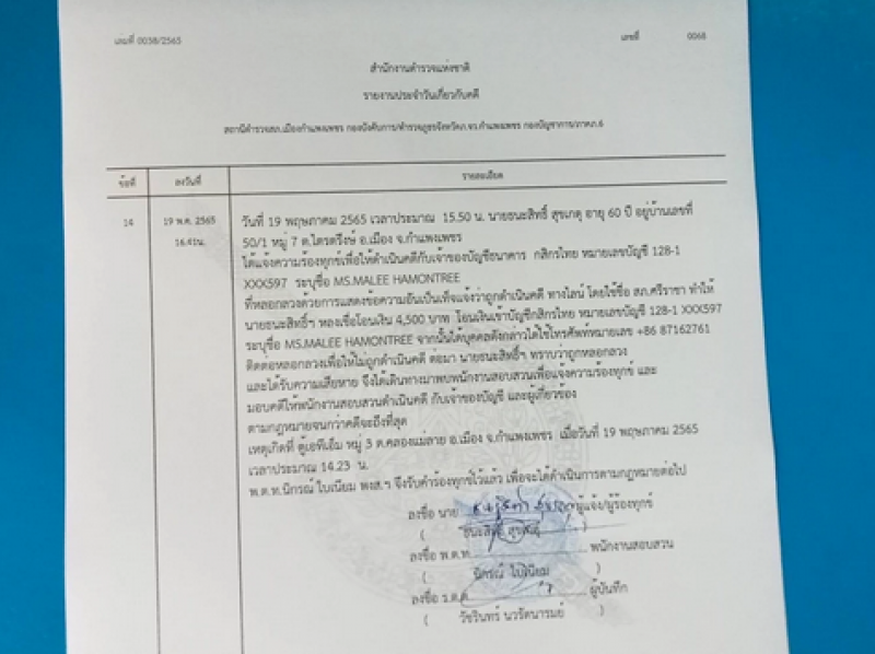 เมื่อถ่ายสลิปส่งไลน์ให้ดู กลุ่มมิจฉาชีพก็เงียบหายไป ก่อนจะเล่าให้ผู้สื่อข่าวที่รู้จักฟัง ทำให้ถูกหลอกแล้ว ก่อนเดินทางแจ้งความที่ สภ.เมืองกำแพงเพชร ดำเนินคคดีตามกฎหมาย