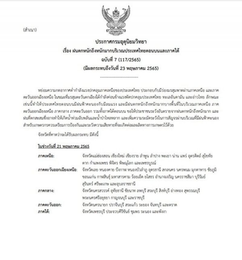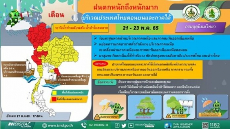 วันที่ 21 พ.ค.2565 กรมอุตุฯ ประกาศ ฝนตกหนักถึงหนักมากบริเวณประเทศไทยตอนบนและภาคใต้ (มีผลกระทบถึงวันที่ 23 พฤษภาคม 2565) ฉบับที่ 7 ลงวันที่ 21 พฤษภาคม 2565 หย่อมความกดอากาศต่ำกำลังแรงปกคลุมภาคเหนือของประเทศไทย ประกอบกับมีร่องมรสุมพาดผ่านภาคเหนือ และภาคตะวันออกเฉียงเหนือ ในขณะที่มรสุมตะวันตกเฉียงใต้กำลังค่อนข้างแรงพัดปกคลุมประเทศไทย ทะเลอันดามัน และอ่าวไทย