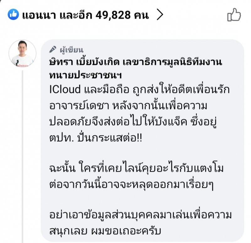 ล่าสุดมีรายงานว่า ทางด้านทนายตั้ม ได้เผยข้อมูลที่อาจบอกได้ว่าใครคือคนที่เล่นเฟซบุ๊กของแตงโม โดยเผยว่า ICloud และมือถือ ถูกส่งให้อดีตเพื่อนรักอาจารย์เดชา หลังจากนั้นเพื่อความปลอดภัยจึงส่งต่อไปให้บังแจ็ค ซึ่งอยู่ ตปท. ปั่นกระแสต่อ ฉะนั้น ใครที่เคยไลน์คุยอะไรกับแตงโม ต่อจากวันนี้อาจจะหลุดออกมาเรื่อยๆ อย่าเอาข้อมูลส่วนบุคคลมาเล่นเพื่อความสนุกเลย ผมขอเถอะครับ