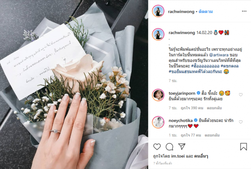 ล่าสุด ทั้งนี้ก้อย มีการโพสต์ภาพพร้อมข้อความว่า ไม่รู้จะพิมพ์แคปชั่นอะไร เพราะทุกอย่างอยู่ในการ์ดใบนั้นหมดแล้ว artiwara ขอบคุณสำหรับของขวัญวันวาเลนไทน์ที่ดีที่สุดในชีวิตนะคะ ฮือออออออออ ตขกตงล ขอยืมแฮชแทคพี่โด๋วละกันนะ