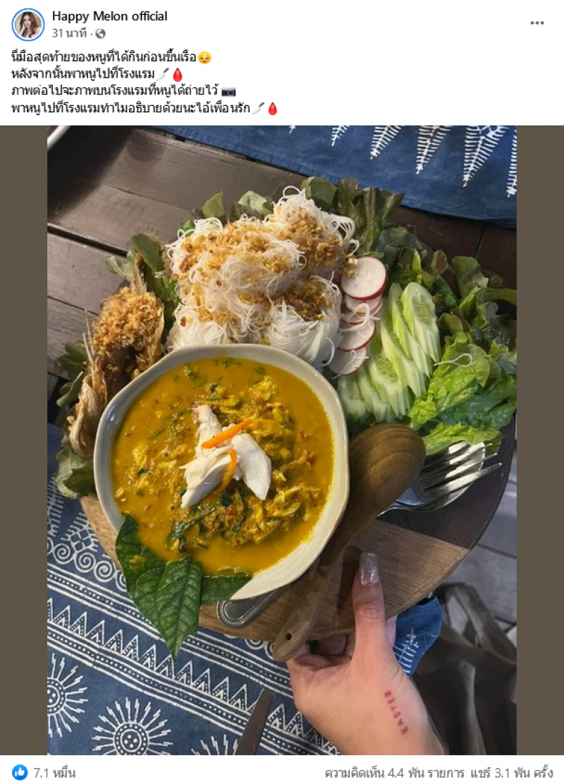 ล่าสุดในเฟซบุ๊กเพจ Happy Melon official ได้มีการโพสต์อีกครั้ง โดยระบุว่านี่มือสุดท้ายของหนูที่ได้กินก่อนขึ้นเรือ หลังจากนั้นพาหนูไปที่โรงแรม ภาพต่อไปจะภาพบนโรงแรมที่หนูได้ถ่ายไว้ พาหนูไปที่โรงแรมทำไมอธิบายด้วยนะไอ้เพื่อนรัก