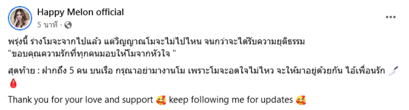 ล่าสุดในเฟซบุ๊กเพจ Happy Melon official ได้มีการโพสต์อีกครั้ง โดยเป็นข้อความพร้อมรูปภาพ