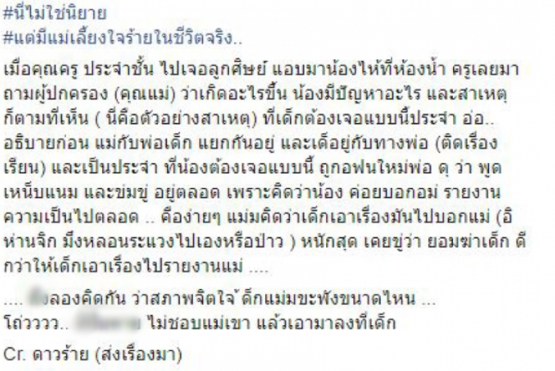 โดยมีข้อความระบุว่า เมื่อคุณครูประจำชั้นไปเจอลูกศิษย์แอบมาปล่อยโฮที่ห้องน้ำ ครูเลยมาถามผู้ปกครอง คุณแม่ ว่าเกิดอะไรขึ้น น้องมีปัญหาอะไรและสาเหตุก็ตามที่เห็นนี่คือตัวอย่างสาเหตุ ที่นักเรียนต้องเจอแบบนี้ประจำ ที่น้องต้องเจอแบบนี้ ถูกแฟนใหม่พ่อ ดุว่าพูดเหน็บแนม อยู่ตลอด