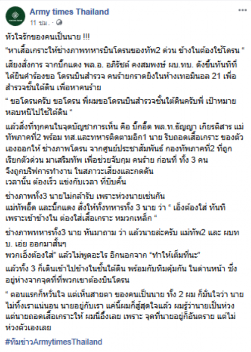 เรียกได้ว่าเป็นเรื่องราวที่กำลังถูกพูดถึงกันอย่างมาก สำหรับการปฏิบัติหน้าที่ของเหล่าทหารที่เสียสละ โดยล่าสุดเพจที่ใช้ชื่อว่า Army times Thailand ได้ออกมาโพสต์เรื่องราวความเสียสละของเหล่าทหาร โดยได้ระบุข้อความเอาไว้ว่า