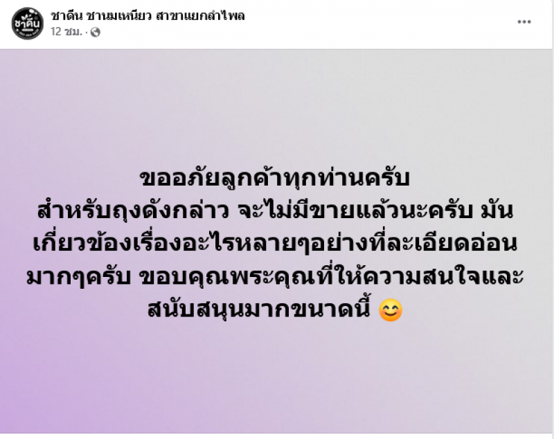 ล่าสุดทางร้านก็ได้มีการประกาศ ยกเลิกขายถุงดังกล่าวแล้ว โดยระบุว่า ขออภัยลูกค้าทุกท่านครับ สำหรับถุงดังกล่าว จะไม่มีขายแล้วนะครับ มันเกี่ยวข้องเรื่องอะไรหลายๆอย่างที่ละเอียดอ่อนมากๆครับ ขอบคุณพระคุณที่ให้ความสนใจและสนับสนุนมากขนาดนี้