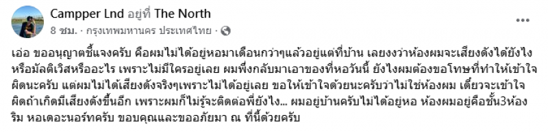 โดยผู้โพสต์ได้ระบุว่า เอ่อ ขออนุญาตชี้แจงครับ คือผมไม่ได้อยู่หอมาเดือนกว่าๆแล้วอยู่แต่ที่บ้าน เลยงงว่าห้องผมจะเสียงดังได้ยังไงหรือมัลติเวิสหรืออะไร เพราะไม่มีใครอยู่เลย ผมพึ่งกลับมาเอาของที่หอวันนี้ ยังไงผมต้องขอโทษที่ทำให้เข้าใจผิดนะครับ แต่ผมไม่ได้เสียงดังจริงๆเพราะไม่ได้อยู่เลย