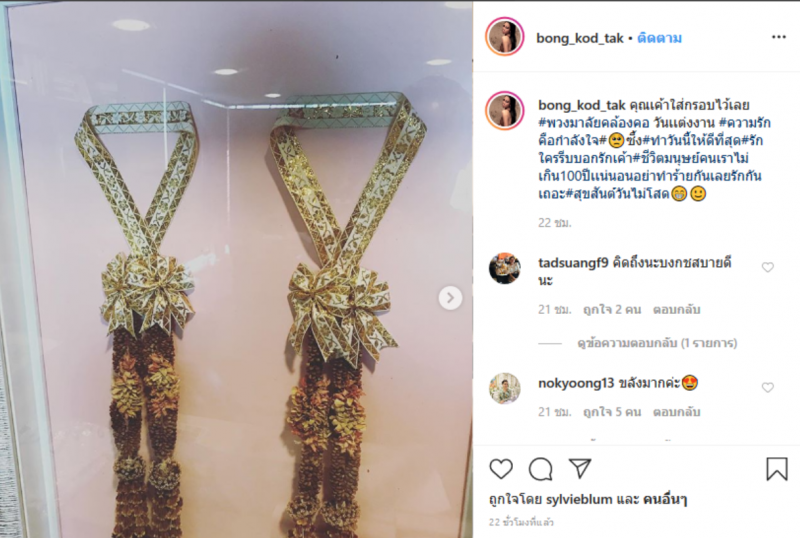 ทั้งนี้ล่าสุดตั๊ก บงกช ได้โพสต์ภาพพวงมาลัยคล้องคอ พร้อมแคปชั่นสุดหวาน ในวันวาเลนไทน์ ด้วยข้อความระบุว่า คุณเค้าใส่กรอบไว้เลย พวงมาลัยคล้องคอ วันเเต่งงาน ความรักคือกำลังใจ ซึ้ง ทำวันนี้ให้ดีที่สุด รักใครรีบบอกรักเค้า ชีวิตมนุษย์คนเราไม่เกิน100ปีเเน่นอน สุขสันต์วันไม่โสด
