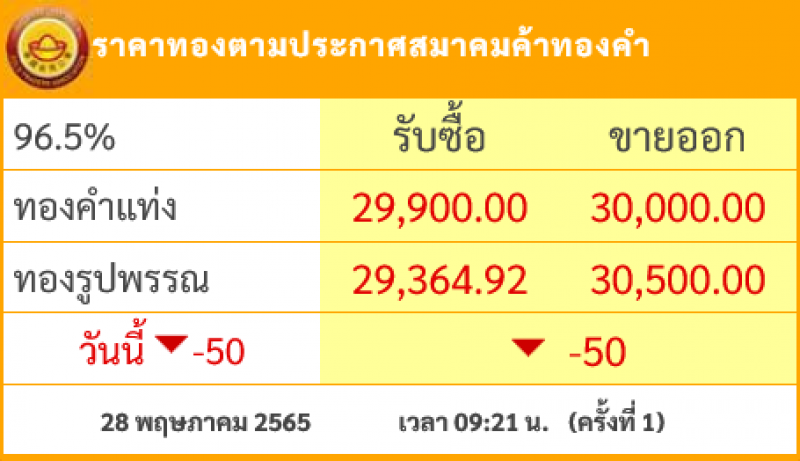 วันที่ 28 พฤษภาคม 2565 สมาคมค้าทองคำรายงาน ราคาทองไทย ครั้งที่ 1 เมื่อเวลา 09:21 น. โดยราคาทองล่าสุดราคานั้น ได้มีการปรับลงมาอีก 50 บาท ในวันนี้ ส่งผลทำให้ราคาวันนี้ทองคำ แท่ง รับซื้อบาทละ 29,900 ขายออกบาทละ 30,000 บาท ส่วนทองรูปพรรณ รับซื้อบาทละ 29,364.92 ขายออกบาทละ 30,500 บาท