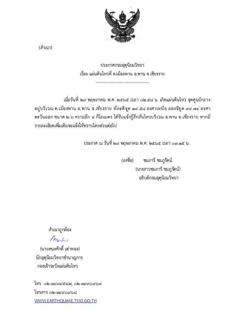เชียงราย เกิดแผ่นดินไหวขนาด 2.6 ริกเตอร์