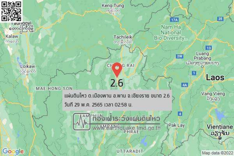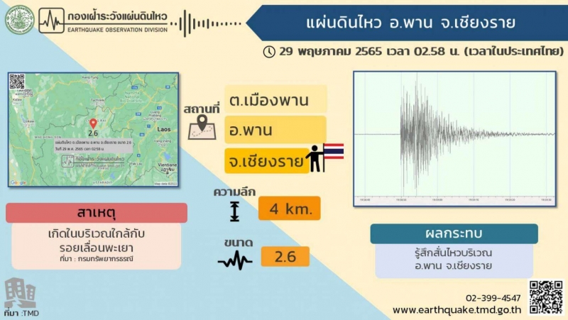 กองเฝ้าระวังแผ่นดินไหวกรมอุตุนิยมวิทยา รายงานการเกิดแผ่นดินไหวว่าเมื่อวันที่ 29 พ.ค. 65 เวลา 2.58 น. เกิดแผ่นดินไหวขนาด 2.6 ริกเตอร์ โดยมีจุดศูนย์กลางแผ่นดินไหวครั้งนี้อยู่ที่ ต.เมืองพาน อ.พาน จ.เชียงราย สาเหตุเกิดจากการเคลื่อนตัวของรอยเลื่อนพะเยา ทำให้ประชาชนที่อาศัยอยู่ใกล้จุดศูนย์กลางแผ่นดินไหวรับรู้ถึงแรงสั่นสะเทือน