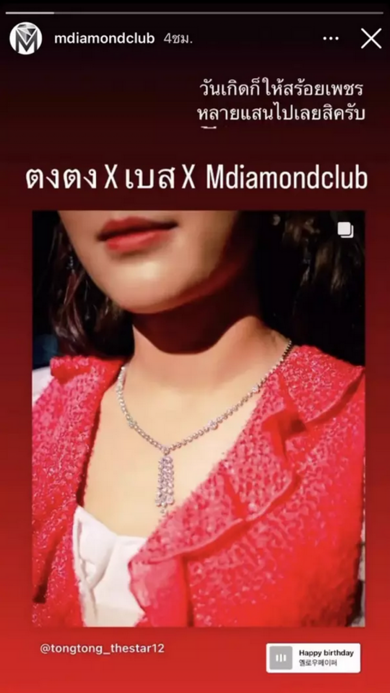 ล่าสุด เจ้าของวันเกิดได้อวดของขวัญสุดพิเศษจากแฟนหนุ่ม เป็นสร้อยคอเพชร 6 กะรัต มูลค่าหลายแสนบาท โดยการโพสต์ลงในอินสตาแกรม พร้อมกับเขียนแคปชั่นเอาไว้ว่า "ขอบคุณของขวัญนะคะคุณชาย เพชรสวยมากค่ะ จะใส่ออกงานบ่อยๆ เลยนะ งานนี้บอกเลยว่าทำเอาหลายๆ คนแอบอิจฉาสาวเบสท์อยู่ไม่น้อย