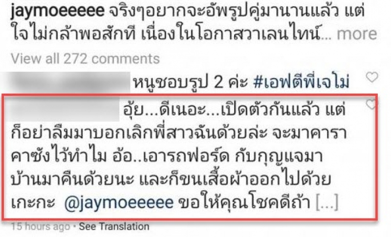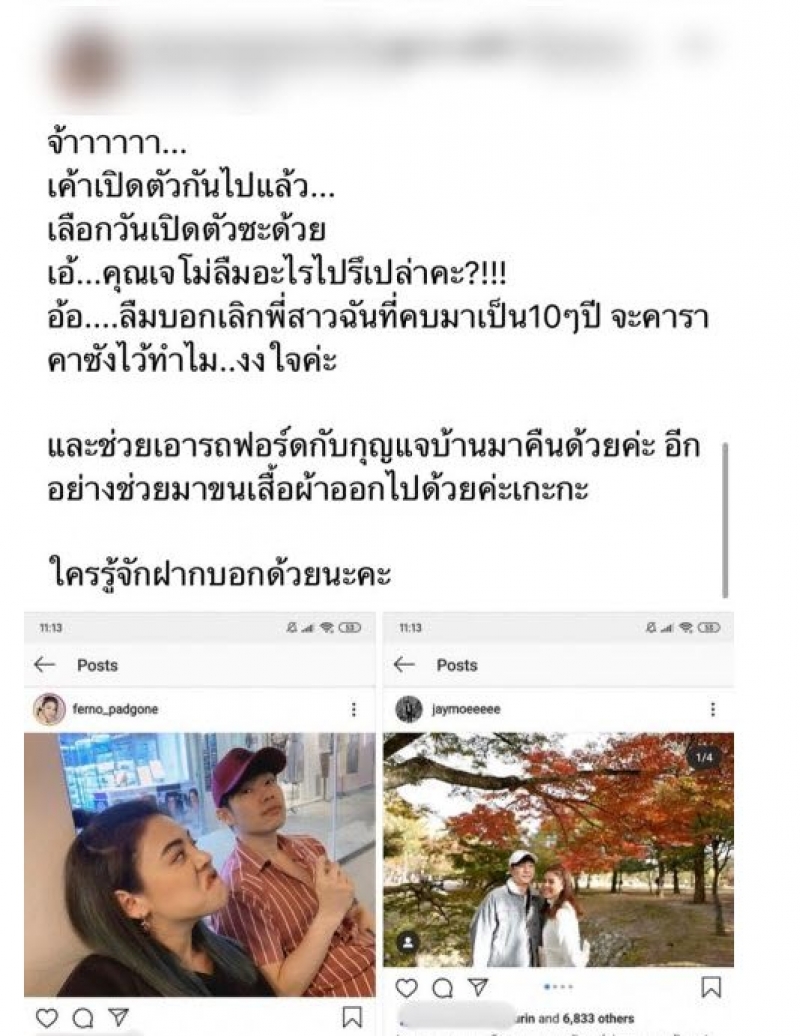 ต่อมา มีไอจีท่านหนึ่งเข้ามคอมอเมนท์ โดยอ้างว่าเป็นน้องสาวของแฟนฝ่ายชายโดยมีเนื้อหาว่า น้องใบเฟิร์น น้องไม่รู้เรื่องคุณผู้ชายนะคะ ไม่รู้เลยค่ะ ผู้ชายปิดมิดค่ะ จ้าาาาาา เค้าเปิดตัวกันไปแล้ว