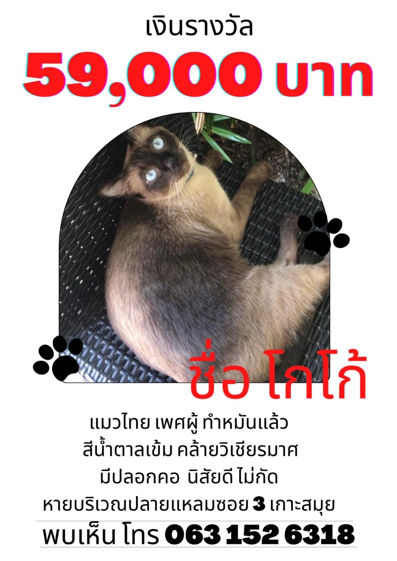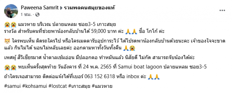 วันที่ 30 พฤษภาคม มีรายงานว่าในโลกออนไลน์ ได้มีผู้ใช้เฟซบุ๊กชื่อ Paweena Samrit โพสต์ประกาศกาสตามหาแมว โดบระบุว่า แมวหาย บริเวณ ปลายแหลม ซอย3-5 เกาะสมุย รางวัล สำหรับคนที่ช่วยพาน้องกลับบ้านได้ 59,000 บาท ค่ะ ชื่อ โกโก้ ค่ะ ใครพบเห็น ติดรถใครไป หรือใครเมตตารับอุปการะไว้ ได้โปรดพาน้องกลับบ้านด้วยนะคะ เจ้าของใจจะขาดแล้ว กินไม่ได้ นอนไม่หลับเลยค่ะ ออกตามหาทั้งวันทั้งคืน เพศผู้ สีวิเชียรมาศ น้ำตาลเข้มอ่อน มีปลอกคอ ทำหมันแล้ว นิสัยดี ไม่กัด สามารถจับน้องได้ค่ะ พบเห็นครั้งสุดท้าย วันอังคาร ที่ 24 พ.ค. 2565 ที่ Samui boat lagoon ปลายแหลม ซอย3-5