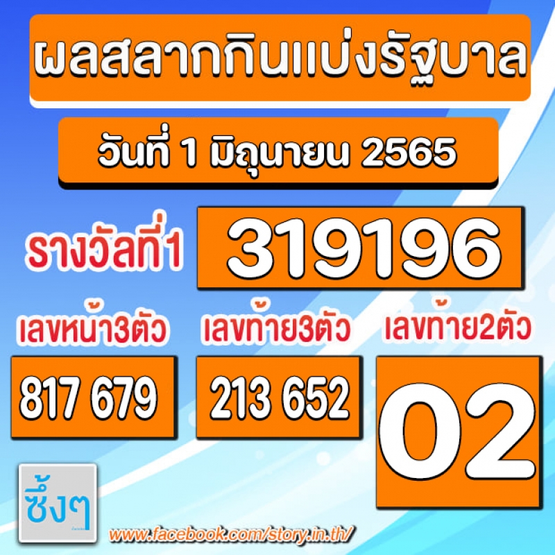 ผ่านไปแล้ว สำหรับการประกาศผลสลากกินแบ่งรัฐบาล ประจำวันที่ 1 มิถุนายน 2565 โดยรางวัลที่ 1 รางวัลละ 6,000,000 บาท เลขที่ออก 319196