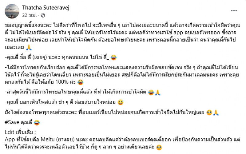 โดยเธอชี้แจงว่าจริงๆ ที่ตี๋ให้เบอร์ติดต่อเอาไว้ เธอจึงใช้แอพลิเคชั่นลบเบอร์ออกเพื่อความเป็นส่วนตัว และนำมาโพสต์บนเฟซบุ๊กของตนเอง