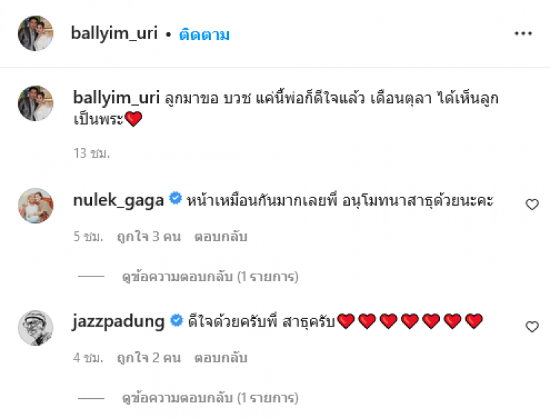 โดย บอล ได้โพสต์รูปคู่ลูกชาย พร้อมเขียนข้อความว่า ลูกมาขอบวช แค่นี้พ่อก็ดีใจแล้ว เดือนตุลา ได้เห็นลูกเป็นพระ หลังจากที่โพสต์ ก็มีเพื่อนพ้องในวงการและชาวเน็ตเข้ามาชื่นชมในความน่ารักของลูกชายและร่วมอนุโมนากันล่วงหน้าอย่างมากมาย