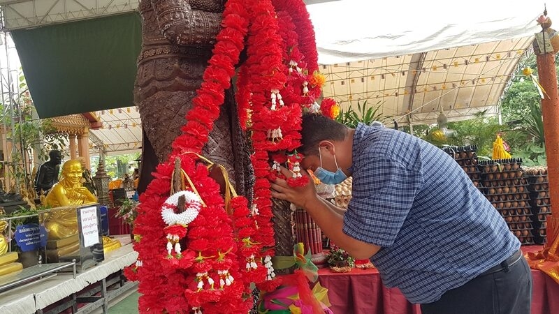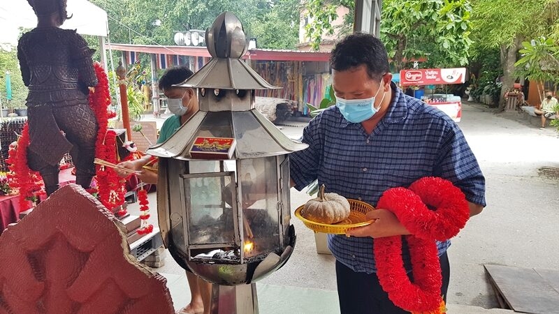 วันที่ 3 มิ.ย.2565 ที่วัดสว่างอารมณ์ แคแถว ต.ขุนแก้ว อ.นครชัยศรี จ.นครปฐม นายภูชิต (ขอสงวนนามสกุล) อายุ 44 ปี ข้าราชการครูชำนาญการโรงเรียนแห่งหนึ่ง เดินทางมาแก้บนด้วยพวงมาลัยกุหลาบสีแดงพวงใหญ่กับองค์ท้าวเวสสุวรรณ ที่ประดิษฐานอยู่ที่บริเวณทางขึ้นศาลาการเปรียญ