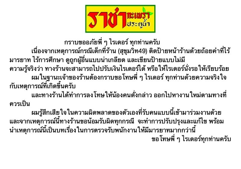 ล่าสุด เพจร้านราชากะเพรา ประตูน้ำ ได้โพสต์ชี้แจงเรื่องดังกล่าว่า กราบขอโทษพี่ๆ ไรเดอร์ทุกท่านครับ เนื่องจากเหตุการณ์กรณีเด็กร้าน (สุขุมวิท49) ติดป้านหน้าร้านด้วยถ้อยคำไร้ มารยาท ไร้การศึกษา ดูถูกผู้อื่นแบบ.... และเขียนป้ายไม่มีความรู้จริงว่า ทางร้านสามารถไปปรับเงินไรเดอร์ได้ หรือให้ไรเดอร์นั่งรอให้เรียบร้อย
