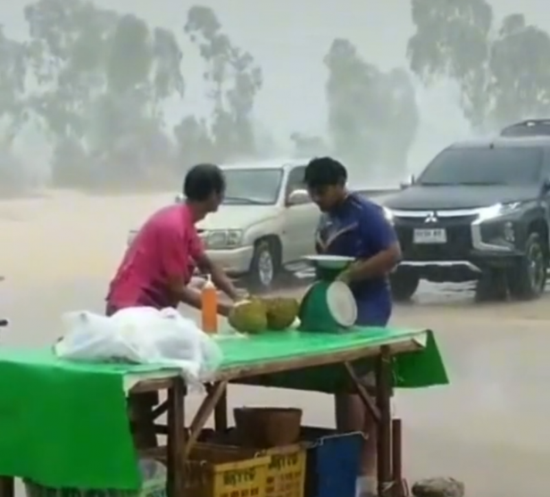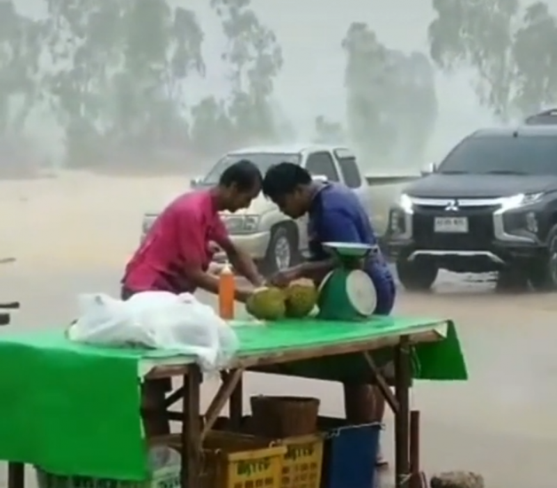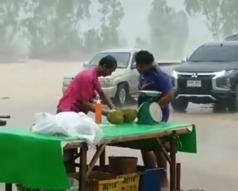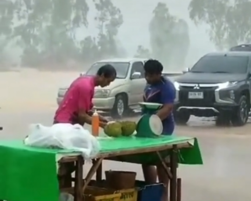 กลายเป็นอีกหนึ่งคลิปไวรัล ที่สร้างความฮือฮาในโลกออนไลน์ หลังจากที่ผู้ใช้ tiktok ชื่อ arseesu_36 ได้เผยแพร่คลิปขณะที่พ่อค้าทุเรียนรายหนึ่งกำลังยืนตากฝนที่กำลังตกหนักปลอกทุเรียนให้ลูกค้าที่ยืนตากฝนเช่นกัน ซึ่งทั้งคู่ดูเหมือนไม่อะไรเกิดขึ้น ก็ยังคงทำการซื้อขายกันอย่างปกติโดยผู้โพสต์ได้ระบุว่า ไม่ซื้อเมียก็ด่า #ไม่ขายเมียก็ด่า #สู้ชีวิตทั้งผู้ซื้อและผู้ขาย
