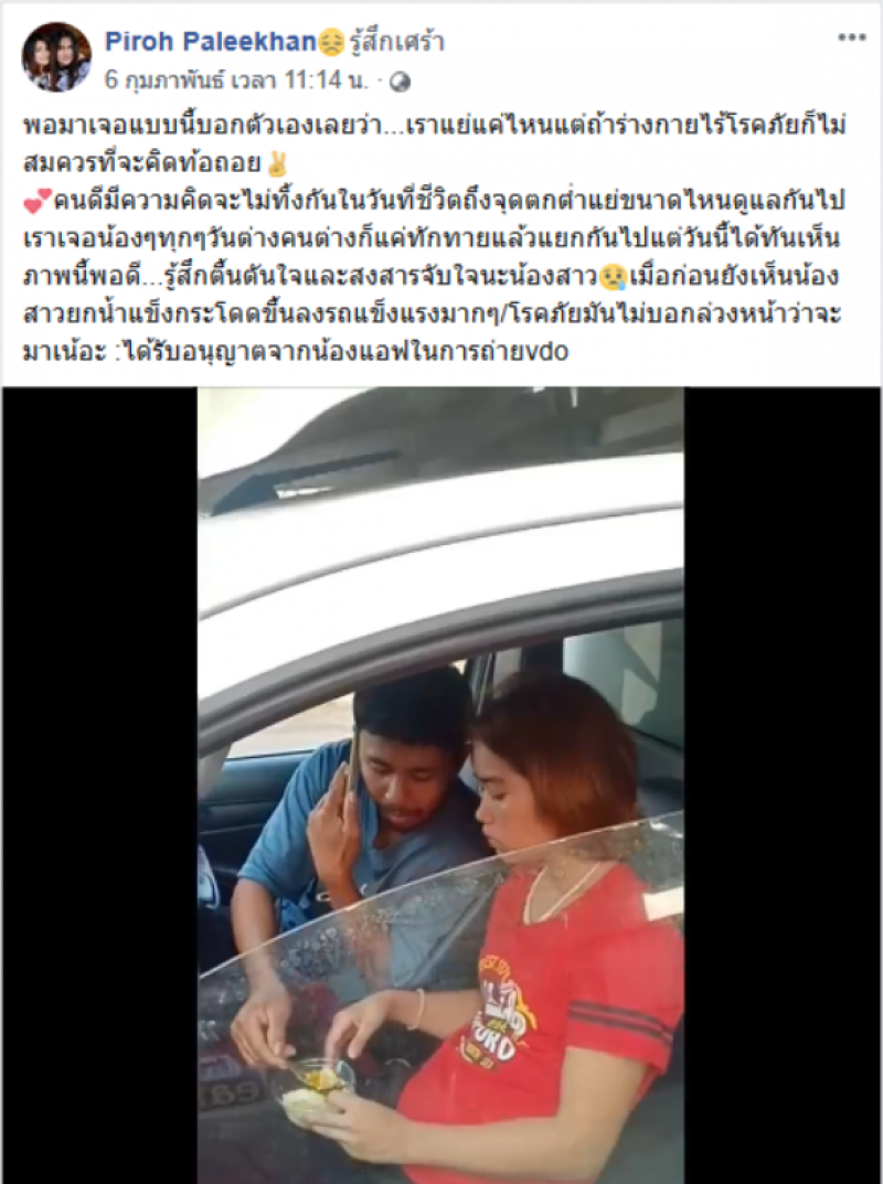 วันที่ 16 กุมภาพันธ์ 2563 ทีมงาน siamtopic ได้รับรายงานว่า บนโลกออนไลน์มีการส่งต่อคลิปเรื่องราวของผู้ใช้เฟซบุ๊กชื่อ Piroh Paleekhan โดยระบุข้อความว่า พอมาเจอแบบนี้บอกตัวเองเลยว่า เราแย่แค่ไหนแต่ถ้าตัวไม่มีภัยก็ไม่สมควรที่จะคิดท้อถอย คนดีมีความคิดจะไม่ทิ้งกันในวันที่ชีวิตถึงจุดแย่ขนาดไหนดูแลกันไปเราเจอน้องๆทุกๆวันต่างคนต่างก็แค่ทักทายแล้วแยกกันไปแต่วันนี้ได้ทันเห็นภาพนี้พอดี รู้สึกตื้นตันใจและสงสารจับใจนะน้องสาว เมื่อก่อนยังเห็นน้องสาวยกน้ำแข็งกระโดดขึ้นลงรถแข็งแรงมากๆ อาการมันไม่บอกล่วงหน้าว่าจะมาเนอะ ได้รับอนุญาตจากน้องแอฟในการถ่ายvdo
