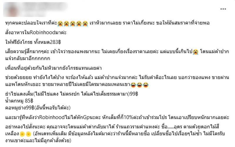 ผู้ใช้เฟซบุ๊กรายหนึ่ง ได้มีการโพสต์เตือน หลังจากที่สั่งอาหารผ่านไรเดอร์แล้วรู้สึกว่า โดนเอาเปรียบจากทางแม่ค้า โดยระบุว่า