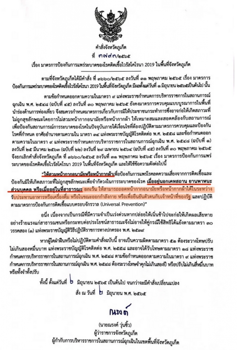ล่าสุดจังหวัดภูเก็ตได้มีประกาศคำสั่งยกเลิก คำสั่งจังหวัดภูเก็ต ที่ 3660/2565 ลงวันที่ 31 พฤษภาคม 2565 เริ่มวันที่ 1 มิ.ย.65 เป็นต้นไป เรื่องมาตรการป้องกัน ในพื้นที่จังหวัดภูเก็ต เปลี่ยนเป็นคำสั่งจังหวัดภูเก็ต ที่ 3793/2565 ลงวันที่ 2 มิ.ย.65 มีผลตั้งแต่วันที่ 2 มิ.ย.65 เป็นต้นไป จนกว่ามีคำสั่งเปลี่ยนแปลง เรื่องมาตรการป้องกัน ในพื้นที่จังหวัดภูเก็ต โดยให้ใช้ข้อความดังต่อไปนี้